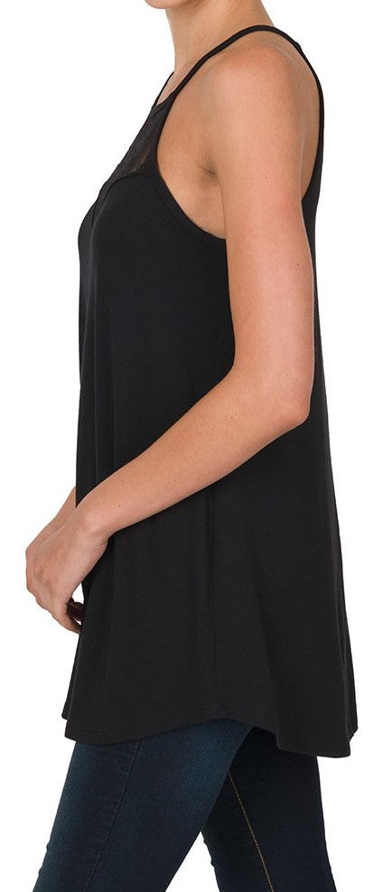 Experience the elegance of this sleeveless halter top featuring delicate lace panels to combine flattering fit with comfort. Made from a soft, stretchy fabric blend of 57% polyester, 38% rayon, and 5% spandex, this top offers both style and ease.