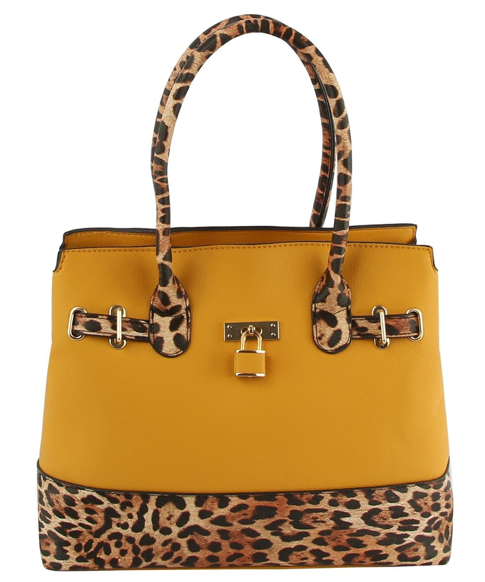 This Leopard Colorblock Satchel features vegan faux leather construction with a secure zip-top closure. Accented by gold-tone hardware and equipped with a detachable shoulder strap, it measures 13 inches long, 10.75 inches high, and 6 inches wide—perfect for stylish and practical everyday use.